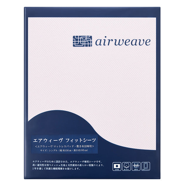 エアウィーヴのマットレスパッド、FUTONシリーズ専用のフィットシーツです。 綿100%の優しい肌触りのメッシュ生地で、通気性、吸水性、伸縮性がよく、エアウィーヴの寝具に最適です。